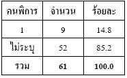 49.2 ไม่ทะเลาะกันมีคนว่างงาน ประมาณ 1-2 คนมีอยู่ประมาณ 9 ครัวเรือนที่มีผู้พิการคิดเป็นร้อยละ 14.8